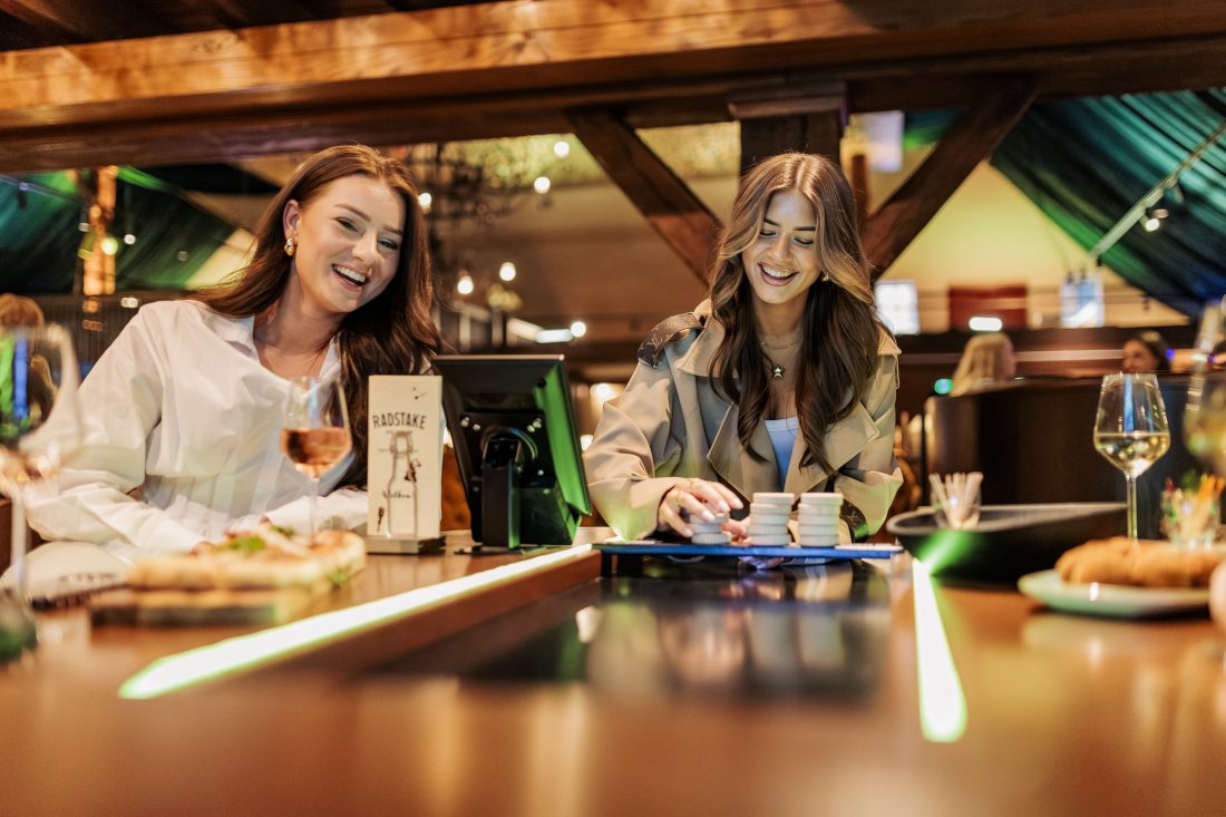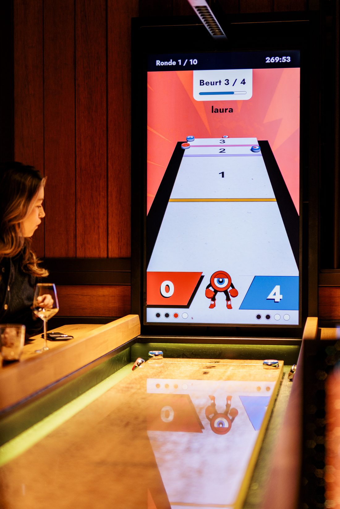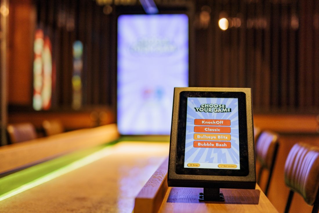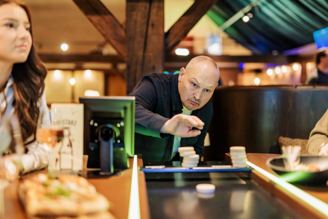 Bij interactief shuffleboarden draait het om gevoel, timing en een beetje lef. Je schuift de pucks over de baan en probeert zoveel mogelijk punten te scoren. Via het scherm kies je uit verschillende spellen. Elk spel heeft een ander doel, dus geen potje is hetzelfde. Het is een combinatie van curling en sjoelen in een hele gezellige barsetting.